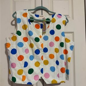 Fun jumpsuit with colorful cartoon design. Features button-up front and short sleeves. Easygoing style.