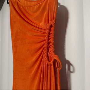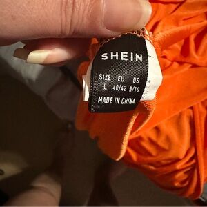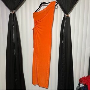 SHEIN Vibrant Orange One-Shoulder Dress. Bold one-shoulder design. Eye-catching orange hue. Slit on one side, Perfect for making a statement. Sheer so perfect for swim suit cover up, giving summer vibes 🩱