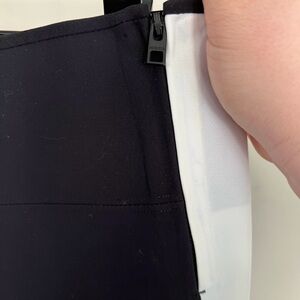 High rise fit with a side zip and hidden button closure. Black with wide white stripes on the side of each leg. Split front hem and a hidden pocket in the back of the waistband. Sleek and flattering fit.