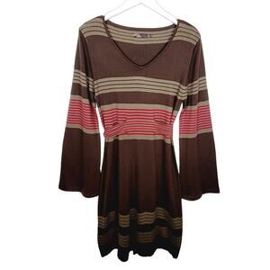 PRANA Brown Striped Sydney Bell Sleeve Belted Knit V-Neck Sweater Dress - M