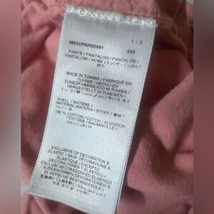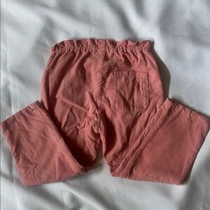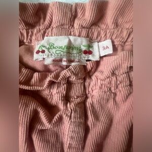 Bonpoint light corduroy paper bag pants in pink. Elasticized waist. Pull on. Back pocket. 100% cotton and lined with soft cotton. Machine Wash. There is a mark on Left knee . Not sure what it is. Not noticeable. Price reflects. Last photo. Needs to be ironed lol. Smoke and pet free home.