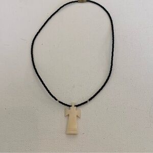 Vintage Bovine Bone Carved Cross Pendant Necklace w Black Glass Seed Beads 18"