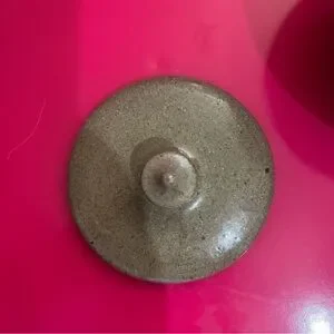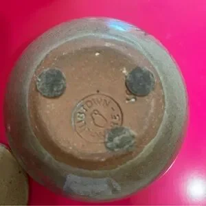This vintage Jugtown Ware pottery small bowl with lid was manufactured in 1991 in the United States. Made of green clay using a pottery production technique, this original piece stands approximately 4 inches tall and 4 inches wide. With a charming and unique design, this bowl with lid adds a touch of rustic elegance to any decor, making it a perfect collectible item for pottery enthusiasts.