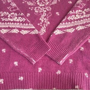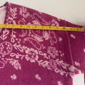 Beautiful Sundance magenta purple vneck long sleeve sweater with cream floral and paisley detail. Drop shoulder. Oversized. Ribbed cuff.