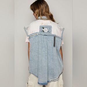 POL Denim Patchwork Embroidered Studded Fishnet Button-Up Vest – Size Small, NWT