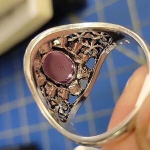 Elegant silver ring with a stunning purple gemstone. Intricate floral design. Perfect for any occasion.