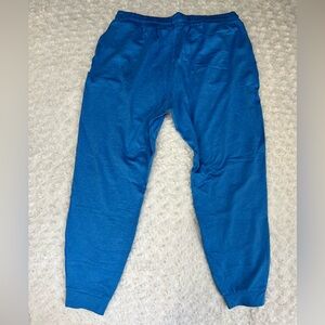 Bright blue joggers with elastic waistband. Features white drawstring for adjustable fit. Ideal for casual outings.