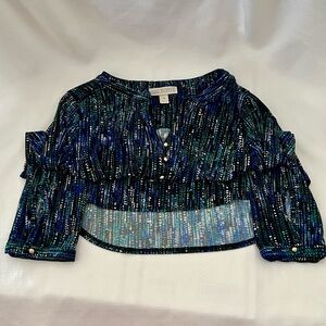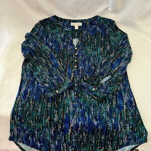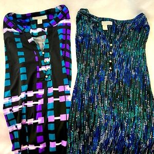Both Like New Condition / One has blue~green hues & One has Purple~black hues. V neckline no collar, 4 accent gold~tone buttons down the front, sleeves have one gold~tone button at the cuffs, t~shirt hemline longer in the back.