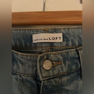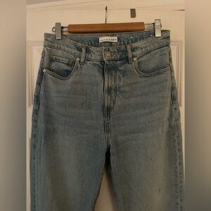 Comfy, cool, and relaxed through the thigh and leg. 12” rise. Fitted at the waist and hip, relaxed into a wide leg. Size 27/4, true to size. Gently worn and in excellent condition. There is a small mark on one of the legs (pictured).