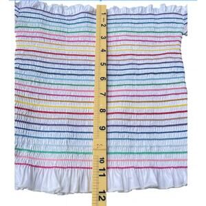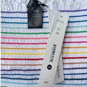 - Brand: Aqua - Color: Rainbow Stripe (multicolor on white base) - Size: XS (Extra Small) - Style 15984 / Cut 22275 - Material: Cotton, Spandex - Standard Condition Rating: New With Tags NWT with Imperfections; there is a small thread imperfection on the back of the top with a visible blue thread (see photo). Features: - Off-the-shoulder neckline with elastic smocking for a secure fit - Rainbow horizontal stripe pattern for a fun, vibrant look - Smocked bodice for stretch and comfort - Short sleeves with ruffle trim - Ruffle detail at neckline, cuffs, and hem for a feminine finish * Aqua rainbow top, smocked blouse, off-the-shoulder ruffle shirt, XS rainbow stripe top, summer party top, vacation outfit, colorful cottagecore blouse, beachwear chic, playful feminine top, spring festival style, rainbow shirt, preppy cute blouse, resort wear, Hamptons chic, summer Note: Some stock images may be AI-generated to illustrate the style. Please refer to the original photos for the exact item being sold.