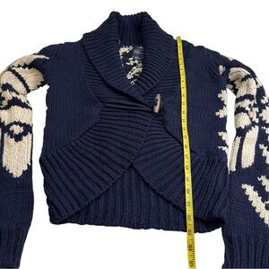Stay cozy and stylish in this American Eagle Outfitters navy blue and cream knit sweater. Size medium, this cardigan features a unique cream floral pattern, a shawl collar, and a charming wooden toggle button closure. Perfect for layering during the colder months, this sweater adds a touch of bohemian flair to any outfit. Its soft knit fabric ensures comfort and warmth, making it a versatile addition to your wardrobe.