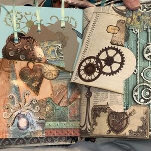 This one-of-a-kind hand crafted Steampunk Mermaid themed junk journal consists of 40 interior pages plus 2 inside covers, adorned with tuck pockets, mini envelopes, hang tags/bookmarks, mini booklets with blank writing pages inside, mini file folder, and coordinating ephemera. The spine is decorated with miscellaneous ribbon, lace and strings, including a strand of multi-colored beads, a beaded tassel, and a steampunk charm. The journal measures 6 inches wide by 8 1/2 inches tall by 5 inches deep and closes with a secure black ribbon tie.
