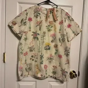Add a touch of designer elegance to your wardrobe with this beautiful blouse from N°21 (Numero Ventuno) by Alessandro Dell’Acqua. Crafted in 100% cotton, this top features a charming multicolor botanical floral print on an ivory fabric. The boxy silhouette, short sleeves, and delicate detailing—like the black back bow, and decorative back button closure—make this a standout piece.