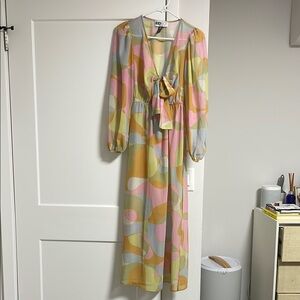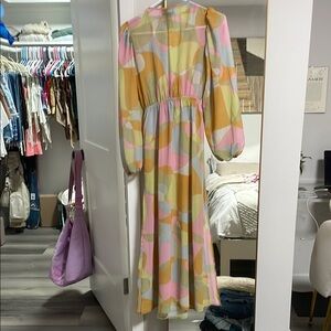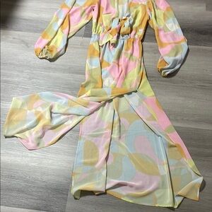 Stylish long sleeve maxi dress with a vibrant multicolor pattern. Features a tie-front detail and flowing silhouette. See through - perfect for a pool cover up or to wear a slip under. Brand new, never worn!