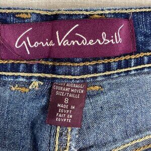 Gloria Vanderbilt Mom Jeans. Women's Tag Size 8 Average. Cotton / poly / spandex blend. Very little stretch. Medium wash blue. Hiigh rise. Straight Leg. Excellent pre-owned condition. No rips, holes or stains. They have been hemmed to 29.5 inch inseam. There is a faded spot on the left front knee area. See photos. Measurements in inches: Waist (side to side) = 15.5 Rise = 11 Inseam = 29.5 Cuff (side to side) = 7.5
