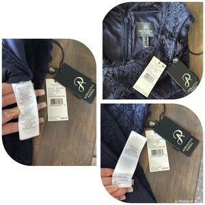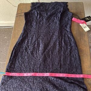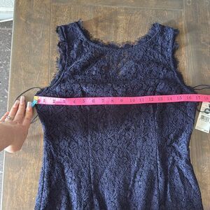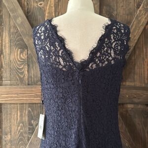 NWT, Step into elegance with this stunning navy lace evening gown. Perfect for formal occasions, this dress features intricate lace detailing and a flattering silhouette. Ideal for making a sophisticated statement. Material composition 56% Viscose, 44% Nylon