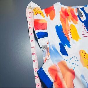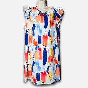 Paint brush abstract print mini dress featuring soft ruffle sleeves and a flattering A-line silhouette. Lightweight fabric with beautiful movement — perfect for warm weather styling.