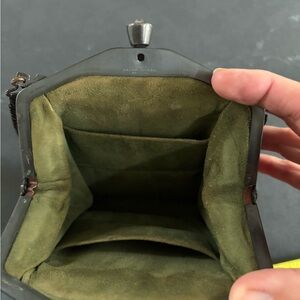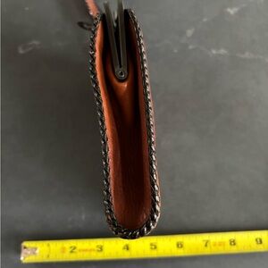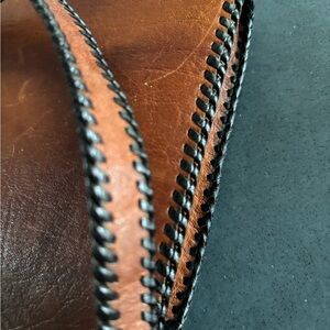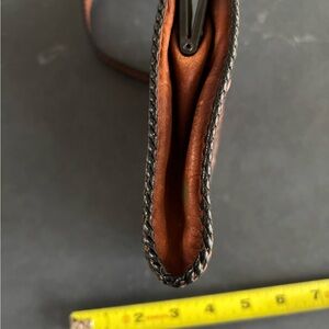 Elegant brown leather handbag with floral embossing. Features a sturdy handle and intricate design. No odors, inside clean. stored and taken care of properly