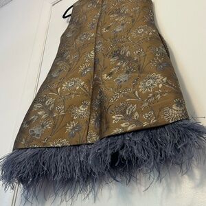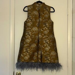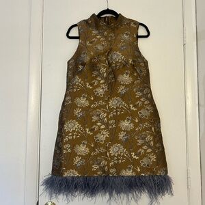 The Cara Cara Tay Dress is made for nights that call for something unforgettable, yet posh! Its metallic jacquard floral fabric shimmers with every step, while the feather-trimmed hem brings just the right touch of drama and playfulness. The tailored mini silhouette flatters without effort, and the mock neckline adds a hint of polish to balance itself. Chic yet statement-making, this is the perfect dress for weddings, cocktail parties, or any celebration where you want to shine with fashion forward sensibility! Originally retailed for $595, now offered at $446 (25% off retail). Category: Women → Dresses → Mini Brand: Cara Cara Size:L Color: Metallic floral jacquard Condition: Excellent, never worn Original Price: $595 Listing Price (25% off): $446