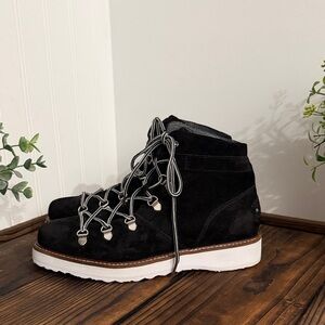 Seychelles brand "Marine Layer" suede clog sandals in mustard yellow. These sandals feature a wooden sole and heel, with a suede strap across the toes adorned with small gold studs. The brand name "Seychelles" is printed on the insole. Seychelles is a shoe brand known for its bohemian-inspired designs and comfortable footwear. The sandals are placed on a wooden surface, possibly a table or shelf, with a white paneled background. They appear to be in new or gently used condition. These clogs combine a retro style with modern comfort, making them suitable for casual wear. Heel Height: 1.75”