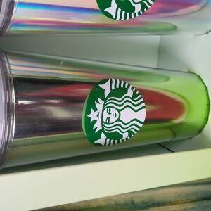 This set of Starbucks Tumblers features a green toned tumbler and a silver/rainbow tumbler.