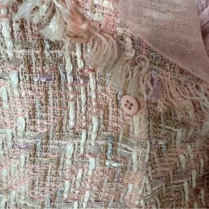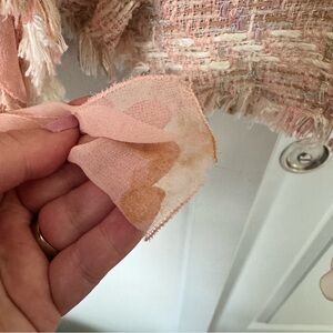 Vintage Albert Nipon light coral pink tweed jacket, size 8. Wool blend jacket has 100% silk around the collar and in the ruffles down the front as well as accents tied around the wrists. Features buttons down the front, several removable floral pins, a light pink lining, and a raw, fringe hem. There are stains on each of the silk ties around the wrists and a small spot near one of the buttonholes (see close-up pictures).