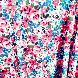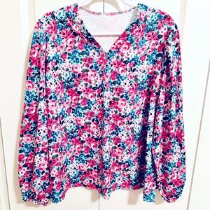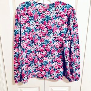 Elevate your style with this vibrant floral V-neck blouse. Featuring a stunning mix of pink and blue hues. 100% polyester. New without tags. Brand’s measurements guide included in pictures.