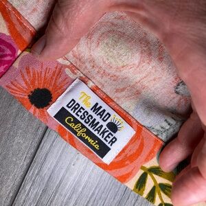 Sleeveless with a sweetheart neckline. The fabric feels like thick cotton or a thick linen. Feels like natural fibers, possibly cotton/linen blend. Two bright floral patterns give you an option of which vibe you want to go with for the day! One side is floral with a pink background and the other side has a black background. The dress has a mid length pleated A line skirt. This dress is custom made and hand sewn by The Mad Dressmaker in California. It is double layered. Please see the measurements, this is a custom piece so there is no size tag. EXTREMELY high quality and well made, this piece is sure to bring you joy!