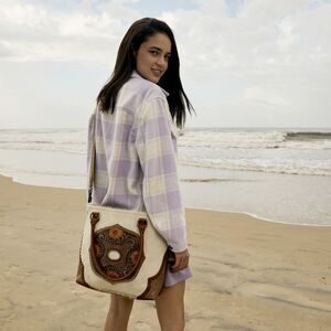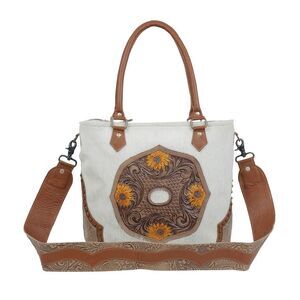 Myra Bag Handmade Burnished Hand Tooled Bag Upcycled Canvas & Cowhide Leather