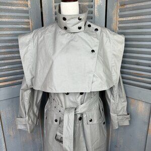 EUC Size Designer 0, US 2-4 Light Grey Coated Cotton Canvas Trench with Vest Gunmetal tone hardware Matching waterproof Cotton Vest -- can be worn separately Double-breasted front snap closure Band collar with double snap closure -- wear up or down Hang loop Adjustable tab and snap cuff closure Removable, adjustable belt with buckle and belt loops Front flap pockets with snap closure Tall side openings with snap closure Vest: Overlapping front snap closure Extended wing shoulders Underarm adjustable snap tab Back box pleat 100% Cotton Snap on right side slit has scratching -- see pic 14 Light, reddish marks on right side back yoke, right side back mid body -- not treated -- see pics 15 & 16 Light, reddish marks on inside collar -- see pic 9 Very faint marks on right front of vest and on left under flap -- see video Video is panning from back yoke to mid back to front right of vest Approx flat measurements: Trench: Armpit to armpit: 24 3/4" Shoulder to shoulder: 17" Sleeve length: 24 1/2" Length (top of shoulder at neck to hem): 45 1/2" Vest: End of extended shoulder to shoulder: 23" Length: 16"