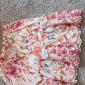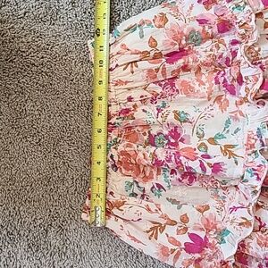 Vibrant floral skirt with ruffle, embroidered, and cutout details. Perfect for any occasion. This skirt is lined and has volume and flutter. It has gorgeous embroidered floral details and an elastic waist with a tie string featuring gold bead detailing. creqmy peach color with vibrant magentas, green, orange, and brown colors. Excellent condition.