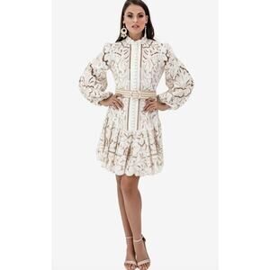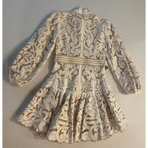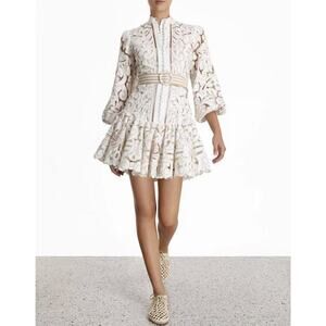 Gorgeous, nightly sought after authentic Zimmermann Edie Floral White Ivory Linen Blend Embroidery Lace Mini Dress. An elegant Victorian-neck mini dress showcasing stunning embroidered lace with ethereal open ladder trim. Featuring a Victorian-neck, long blouson sleeves, puff shoulder, button placket and a belted waist. A Flounce hem and fully lined.