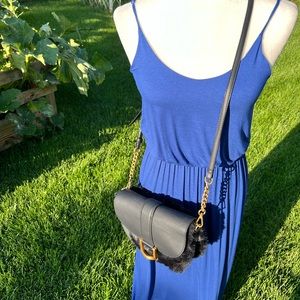 Really cool faux fur Crossbody with faux leather top flap. Gold toned buckle front with gold toned detachable chains attached to sides of purse and strap. Strap is adjustable. Snap closure in front and back. In excellent condition. Very lightly used.
