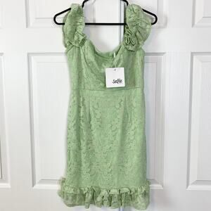 Brand new with tag! Selfie Leslie Verona Off-Shoulder Lace Overlay Mini Dress in Apple Green. You'll feel like you've been swept up in your own romance novel in our gorgeous Verona dress. Perfect for a wedding or birthday soiree, we are head over heels for its off-shoulder frill sleeves and stunning lace overlay.