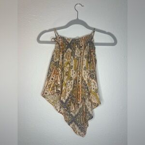 Floaty and flirty! This Olivaceous handkerchief hem cami features a vintage-inspired print in earthy mustard, gray, and orange tones. Adjustable shoulder ties with tassel accents and a smocked neckline give it a fun, boho vibe. ✨ Details: • Brand: Olivaceous • Size: Medium • Adjustable tie straps with tassels • Smocked neckline • Handkerchief-style hem • Lightweight, flowy fabric • good pre-owned condition - some wear on straps 🌼 Perfect for festivals, beach trips, or layering over a bralette or bikini!