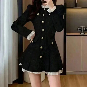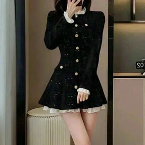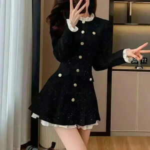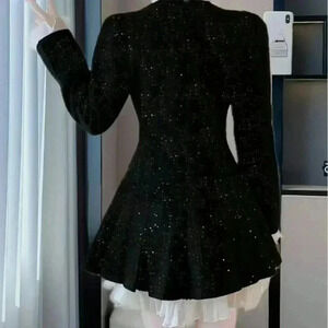 Black Elegant Women's Sequin Tweed Spliced Pleated Single Breasted Mini Dress