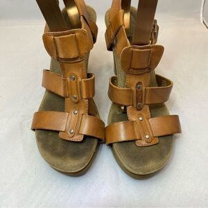 Dr. Scholl’s Women Tan Brown Sandals Chunky Wooden Heel OpenToe Strappy size 8