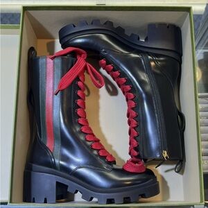 New GUCCI Black Leather Sylvie Web Stripe Lace Up Combat Boots Size 36.5