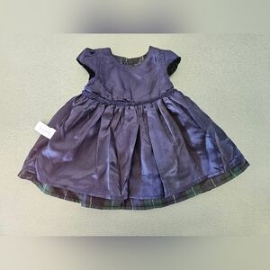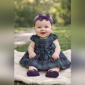 Adorable The Children’s Place baby girl dress in a festive navy and green tartan plaid with subtle metallic gold thread accents. Features a sweet bow at the waist, short sleeves, and a full skirt with lining for extra volume. Perfect for holiday photos, special occasions, or family gatherings.