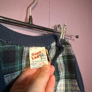 Adorable vintage button-up toddler jacket by Good Lad of Philadelphia, size 3T. Made in the USA, this classic piece features a cozy wool blend, navy blue knit sleeves and trim, and a green plaid flannel front. Finished with charming gold-tone buttons for a timeless, preppy look.