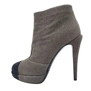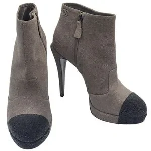 CHANEL CC Logo Cap Toe Glitter Suede Ankle Boots/Platform Booties. Color: gray/greige, black. Size: EU 40. Style #: G27830. Made in Italy.
