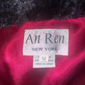 An REN Black faux fur coat featuring a striking red satin lining and a decorative brooch affixed to the front lapel. Includes wide folded cuffs on the sleeves and a flowing silhouette. The closure at the front utilizes buttons, and the coat is fully lined. The brooch design incorporates rhinestone accents.