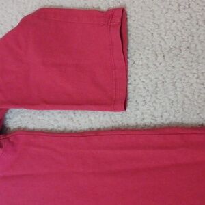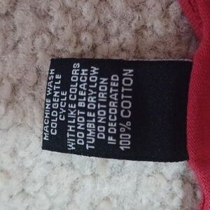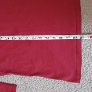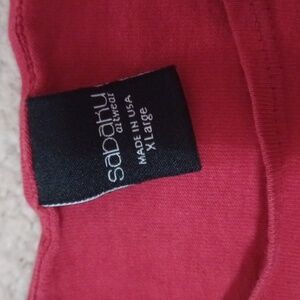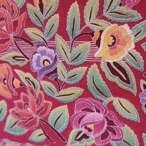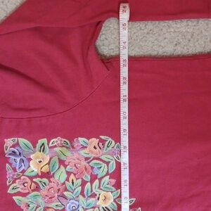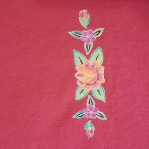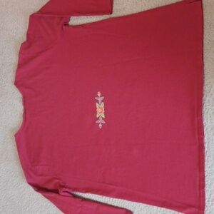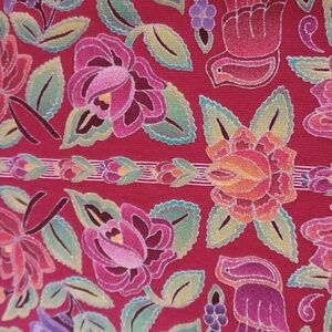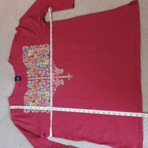 XL sabaku artwear 100% cotton 3/4 sleeve top. red with a floral design. small hole in the sleeve, as pictured. multi color floral design, the silver in the design has a bit of sparkle to it. except for the sleeve, the top is in great condition.