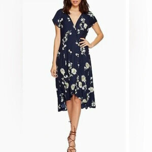 Check out this brand new with tags Free People Lost in You midi length dress. A high low hem shows off your legs in front but provides sway and flow in back. Floral print. Knee length. V neck. Fabric covered buttons. Darting at bust. Short sleeves. Wrap front with diagonal buttons. Blue, white, green and yellow all over design. There is one button that is missing (see last photo). 100% rayon. Size XS.