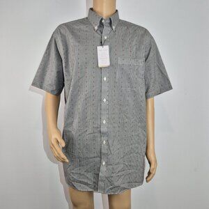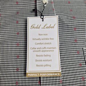 This is a Roundtree & Yorke Gold Label men's shirt in size S. It features a black plaid pattern, short sleeves, button closure, collared neckline, and is made of cotton. The shirt is machine washable and easy to care for, with a non-iron and wrinkle-resistant fabric. It is suitable for travel and casual wear, with a regular fit and button-down collar style. Perfect for all seasons, the shirt has pockets and a metal-themed design.