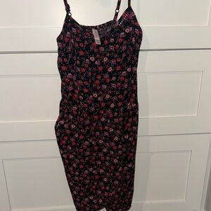 Chic black jumpsuit with a draped silhouette. Features spaghetti straps and a stylish V-neckline.