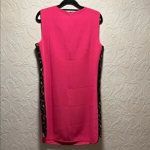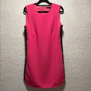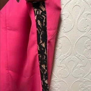 Chic sleeveless dress with bold pink hue and black lace panels . Perfect for stylish outings.