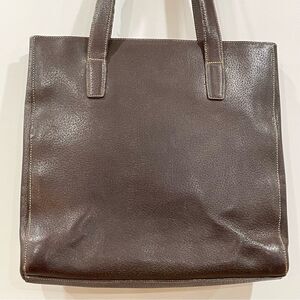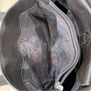 Beautiful chocolate brown retro tote with outside wallet compartment and tons of storage and compartments inside paisley lining with contrast stitching outside. No material tag, not a heavy bag but does have a slight weight and seems to be durable, good quality. Good bag for school or work, space for iPad, etc. In good pre-own condition.