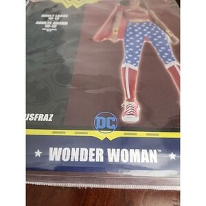 The Wonder Woman Costume DC Comics Leggings Cape Gauntlets Top in size L is a complete outfit perfect for Halloween. Made by DC Comics, this outfit features a red color with elastic/stretch material for a comfortable fit. The design includes a Wonder Woman theme, with a cape, gauntlets, and top to give a stylish and iconic look. Ideal for adult women looking to dress up as the popular superhero for a fun and festive occasion.