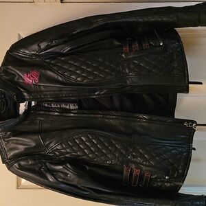 Stylish black leather jacket with quilted design. Features red accents and a unique embroidered logo.